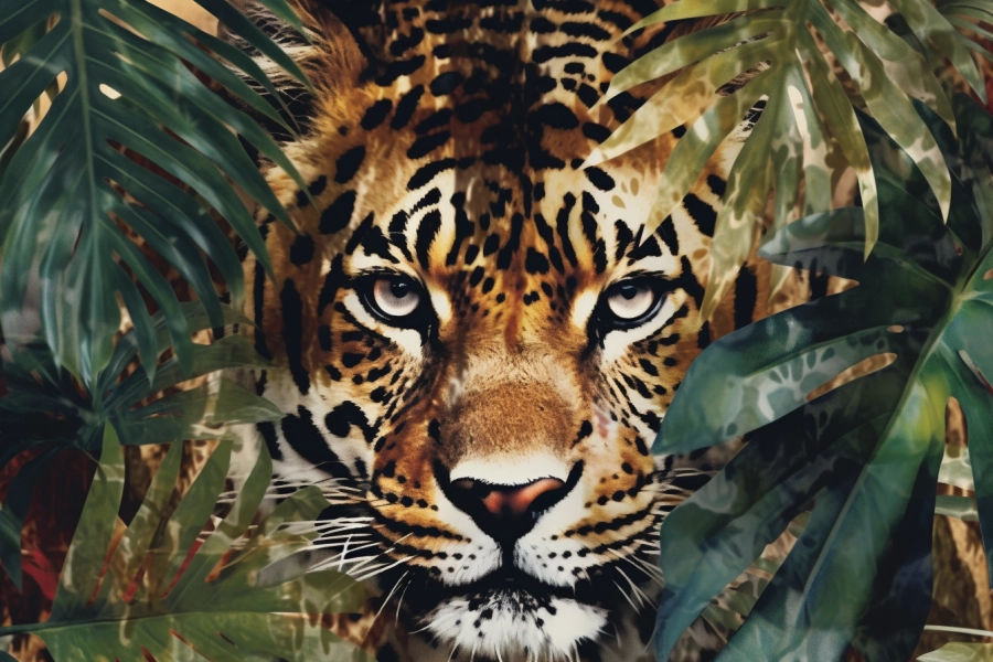 Collage of animal patterns featuring a leopard and monstera leaves in an elegant style.
