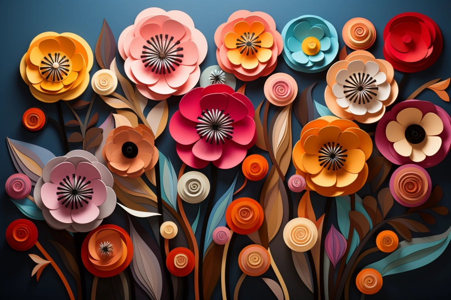 Abstract flowers in bright colors inspired by the style of Victor Vasarely, combining geometry and optical illusions.