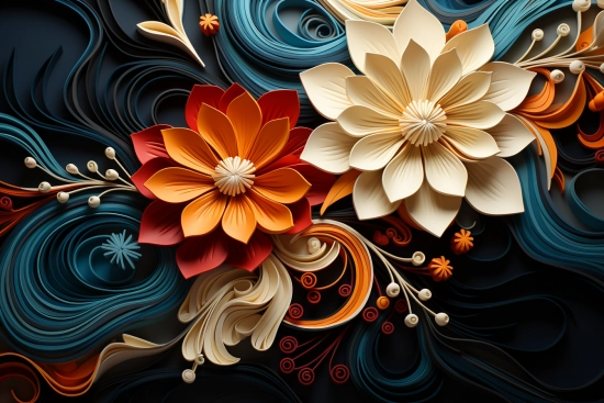 Dark aquamarine and orange parametric flowers in sinusoidal waves style with gold and pink accents. Fractional coordinates and interesting texture.